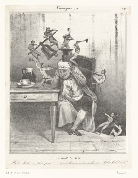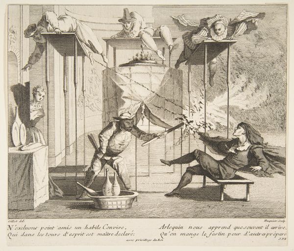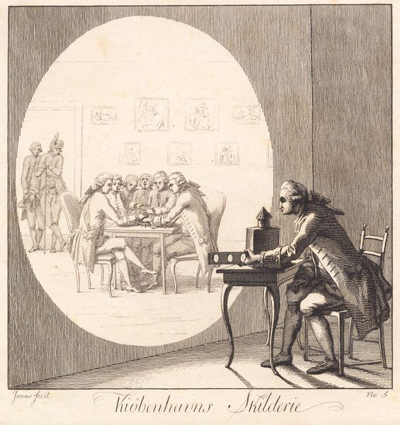Curator: Here we have "Kiøbenhavns Skilderie", nr. 2 by J.F. Clemens, an etching dating from around 1785-1788. The image is rather dreamlike in how it represents a shadow play performance. What stands out to you first? Editor: Immediately, it's the stark contrast—the focused spotlight effect isolates the action. A tale within a tale! There’s a delightful sense of whimsy undercut by the sharp realism of the man operating the projector. Curator: Indeed! The whole composition has a performative feel; look how the main actor appears so devoted, while we, the viewers, become doubly voyeuristic. The symbolism of light and shadow feels prevalent, as it reveals truths while simultaneously obscuring them. Editor: Precisely! The shadow puppets evoke folklore—a shared cultural memory re-enacted. Notice the costuming; a caricature of traditional garments perhaps, highlighting a specific social critique or a popular story of that era? The arrow being readied to fire is a great focal point. Curator: Good catch! The narrative itself is shrouded; our task, as observers, is to reconstruct meaning from visual clues. Also note how Clemens masterfully plays with scale; the diminutive size of the stage performance intensifies the grand effect it must have on the viewer! Editor: Scale is so key. It makes you think about perspective, illusion and also the real power of storytelling. The little lamp is creating this world—the image itself becomes a commentary on the human desire for stories and spectacle. And also this sense of wonder and control. Curator: And how even the simplest of tools, a lamp and shadow puppets, can transport us to other worlds, reminding us of the magic embedded within our history, traditions, and, well, simple visual pleasure. Editor: Absolutely. Clemens here speaks to a basic, enduring impulse: we want to be moved by stories, and we have always found ingenious ways to bring those narratives to life, even with just silhouettes on a wall.