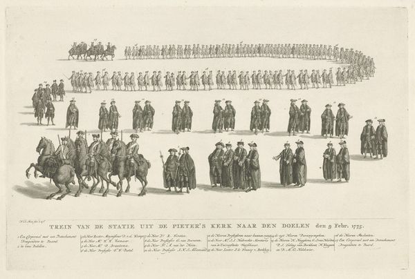 Curator: This engraving by Rienk Jelgerhuis depicts the funeral procession of Maria Louise in Leeuwarden, back in 1765. Editor: It's visually quite striking; all those figures, starkly arranged in lines, processing through the town. There's a real sense of sombre spectacle about the event being depicted. Curator: Indeed. Consider the sharp contrast afforded by the print medium. The use of engraving allows for incredibly fine lines, creating a detailed yet austere visual record. It seems the intent was documentary rather than expressive. Editor: Yet even with its documentary purpose, the medium and composition influence the feeling of it, right? The emphasis on line, for instance, emphasizes the scale of the undertaking. I'm especially drawn to the procession itself – who were these people involved in moving the body and what labor division did that mean at the time? Curator: Precisely. We might even apply semiotic analysis, viewing each grouping and placement of individuals, from city structures to figures. What statement is being made through their placement? For example, notice how the procession flows directly to that high wall; the church's entrance. Editor: I'm more struck by what's materially evident about the society through the print's implicit subject position, such as the clothing of the participants, which suggests a fairly elaborate textile production. What fabrics are used? What access did each member have? Curator: A fair point. We're given a visual depiction of the society's structure; an articulation of who is privileged to participate in such an event, the types of textile reserved for the higher figures or the religious participants. It speaks volumes about social and economic conditions. Editor: For me, it evokes reflections on the very hands-on nature of producing prints at this moment in time – thinking about the labour Jelgerhuis invests physically etching each figure for distribution, a poignant detail in relation to the portrayed burial. Curator: It shows how even an apparently straightforward depiction can open doors to understanding structures and forms—or spark a tangible material understanding of historical life. Editor: Precisely; whether considering the process of its making or how that mirrors those participating, this feels so profoundly informative about Friesland at that historical juncture.