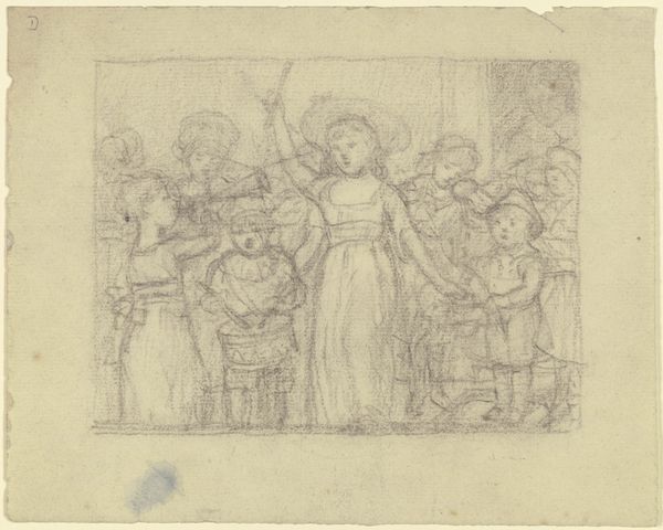 Editor: Here we have Carl Philipp Fohr's "Szene aus dem italienischen Volksleben," a pencil drawing from around 1816-1817. It strikes me as light and airy, almost like a memory being sketched out. What do you see in this piece? Curator: Immediately, the circle they form speaks of ritual and community. The dance itself, though lightly rendered, echoes traditions stretching back centuries. Look at how Fohr uses the pencil – the faintest lines suggest a crowd, a shared experience almost fading into collective memory. Editor: So, it's about more than just a snapshot of Italian life? Curator: Precisely. Consider the period – the early 19th century, a time of burgeoning Romanticism. There's a longing here, a yearning for an idealized past embodied in this rustic scene. The musical instruments evoke festivity, yet also a melancholic sense of transience, *memento mori.* Notice, the central dancer isn’t grounded; her foot barely touches the sketch of the circular dance floor. Is that a fleeting feeling? Editor: It feels like Fohr's trying to capture something intangible, something felt rather than explicitly seen. Like the emotions, nostalgia, or cultural identity being celebrated in this community ritual are hard to materialize or touch in the physical form. Curator: Exactly! It invites us to ponder our own relationship with the past and its visual languages, no? It serves to illuminate the subtle and powerful ways that imagery shapes our cultural consciousness. Do you think this way of using and rendering an image of a common social performance helps perpetuate a specific image about a community? Editor: Definitely. This piece is more evocative than descriptive, making the past feel accessible but also carefully constructed. It reminds us to consider the choices inherent in representing any culture. Curator: I agree completely. Art can shape memory as much as it reflects it. Thanks, this reflection makes this imagery richer.