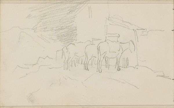 Editor: This is Anton Mauve's "Paard en wagen," or "Horse and Wagon," a pencil drawing that’s estimated to have been made sometime between 1848 and 1888. It's currently housed at the Rijksmuseum. There's a kind of starkness to it, achieved through a minimal use of line and tone. How do you read its composition? Curator: The image demonstrates a profound economy of means. Notice how Mauve delineates form almost exclusively through line; there’s very little shading to indicate volume. Consider how this impacts the viewer’s perception of depth and space. What is created instead? Editor: An emphasis on the subject as an idea, more so than a depiction of it. Is the sketch incomplete, or should it be understood as a work on its own merits? Curator: Precisely! The suggestive lines almost beckon the viewer to participate in the artwork’s completion through mental extrapolation. In terms of structure, let’s analyze the strategic positioning of the figures within the wagon against the solid presence of the horse. The variance creates dynamism. Are there particular elements or choices that seem more visually engaging or meaningful than others? Editor: The figures are sketched with more apparent freedom; it’s looser somehow, and this suggests movement to me. But if you remove that component, what remains? Is the overall quality indicative of mere impression, rather than complete, intentional realism? Curator: A Formalist might say the interplay between realism and impressionism offers a discourse. Consider this artistic decision in terms of formal contrast, and as symbolic within its representation. Thank you for drawing attention to the interplay between technique, style and theme in this genre scene! Editor: Right, seeing the interplay gives more complexity than I first understood.
