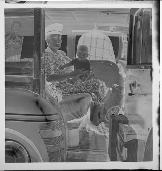Editor: This small, undated photograph by Jack Gould, held at the Harvard Art Museums, depicts an elderly woman in a sailor hat holding a baby. The composition, though a bit obscure, is striking. What do you see in this piece? Curator: The high contrast immediately draws the eye, doesn’t it? Note how the artist utilizes the negative space, almost obscuring the subjects, which forces us to focus on the formal elements: the geometry of the vehicle's interior, the textures of the clothing, and the stark contrast between light and shadow. Editor: So, it's more about the visual relationships than the narrative? Curator: Precisely. The relationships between these elements create a tension, an ambiguity that prevents a singular reading. It becomes a study in form and tonality rather than a straightforward portrait. Editor: That makes me see it in a whole new way. Thanks! Curator: Indeed. The interplay of form and shadow offers an intriguing perspective on the photographic medium itself.