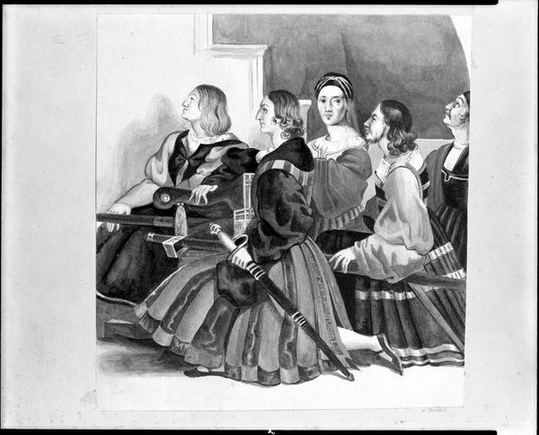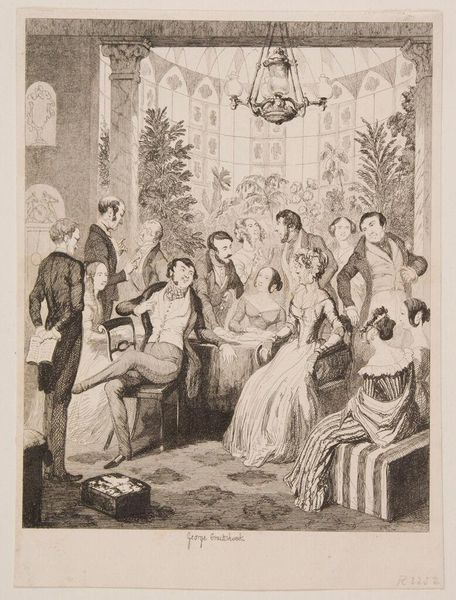 Curator: Let’s spend a few moments looking at “The Washington Family,” a print made around 1800 now residing here at the Metropolitan Museum of Art. Editor: My initial impression is one of staged formality. The figures seem posed, almost like mannequins, carefully arranged to project a certain image. Curator: Absolutely. Prints like this, rendered in black and white, circulated widely and were critical in establishing a visual language for American identity. Look at Washington. The artist intends us to see not just a man, but an icon of authority, striding confidently. Editor: The composition definitely reinforces that. Note the diagonal lines created by his body and extended arm, contrasted against the receding orthogonal of the steps, that dynamically intersects with the passive verticals of the columns in the background. However, what about the figures off to the left, huddled passively? Curator: Those would be his family, including his wife Martha and her grandchildren. They are grouped to signal domesticity, while their luxurious garments evoke prosperity and privilege. Notice too, in the background a Black groom holding Washington’s horse; that evokes the legacy of enslavement as part of America's early social fabric. Editor: So the artist balances domestic tranquility with the outward display of power, subtly highlighting the era’s reliance on subjugation as a signifier for authority. Semiotically speaking, the image operates as an elaborate emblem of the new nation's contradictions. Curator: Precisely. Each element—the architecture, the dress, even the landscape—contributes to the carefully constructed symbolism. What echoes through me as an Iconographer, is this enduring image is that the symbols established then continue to exert their influence, in altered but related forms. Editor: This print is a fascinating example of visual rhetoric. What appears simple, actually demonstrates a very complex construction of image. One of great power. Curator: Indeed. “The Washington Family” is more than just a picture, it's a document, deeply entangled with the myths and realities of early American identity.