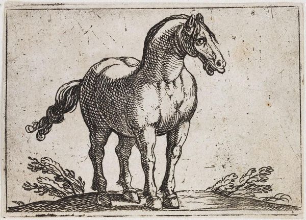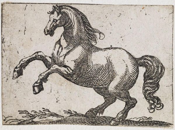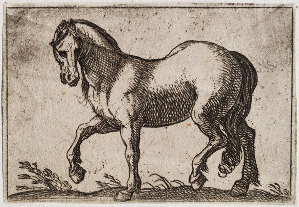Curator: This dynamic etching, titled "Horse Galloping to the Right," comes to us from the hand of Antonio Tempesta, who lived from 1555 to 1630. The crosshatching immediately gives the animal an interesting texture. Editor: There's a marvelous sense of contained energy, isn't there? The tight composition focuses all attention on the horse's forward motion, a testament to power. Curator: Indeed, Tempesta's use of line creates not just form but also a feeling of vitality. One can practically hear the pounding hooves. The piece reflects the increasing value placed on horses as symbols of status and military power during the period. Editor: The scale adds to the impact, making it feel almost monumental despite the small format, doesn't it? It's an image laden with societal implications. Curator: A remarkable convergence of form and historical context, wouldn't you agree? Editor: Absolutely, a tiny window into a world of power and representation.