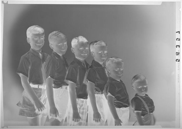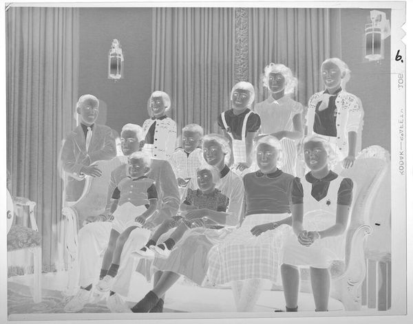 Curator: Here we have an untitled photograph by Lucian and Mary Brown, a class picture measuring about 4x5 inches. What's your first take? Editor: It's haunting, almost spectral. The inverted tones give it this eerie glow, like a ghost class from a forgotten schoolhouse. Curator: Indeed. The stark contrast emphasizes the composition, drawing attention to the children's arrangement and the whimsical mural behind them. Editor: That mural...it’s like a child's dreamscape turned slightly sinister. Trains, swans, a cow...all bathed in this unsettling light. I wonder about the photographer's intent. Curator: The Browns leave no clues; the focus is purely structural. The negative space, the interplay of light and shadow—it all contributes to a compelling formal study. Editor: Maybe. But for me, it’s the vulnerability etched onto those little faces that speaks loudest. A forgotten moment, resurrected in a disquieting way. Curator: A fitting interpretation. The photograph undeniably holds an arresting power, regardless of the artists' intentions. Editor: It lingers, doesn't it? A visual echo of childhood innocence and its darker undertones.