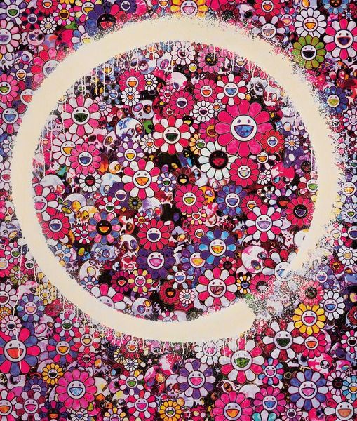 Curator: Looking at this piece, I'm immediately struck by the simultaneous sense of whimsy and melancholy. It's a visual paradox. Editor: That tension is definitely there. We are standing before Takashi Murakami’s "Enso Blue," created in 2016 using acrylic paint. Murakami masterfully blends pop aesthetics with darker undercurrents, and situates this work amidst contemporary debates about globalization and consumer culture. Curator: The circular Enso itself, traditionally a Zen Buddhist symbol, is quite powerful. The very drippy execution feels very human and fragile but the gesture of making it evokes themes like enlightenment and the void. Do you feel that the image has resonance with ancient forms and themes, while simultaneously critiquing commercialization and manufactured experiences? Editor: Absolutely. The superflat aesthetic flattens historical context and depth, commenting on our contemporary moment, but then the incorporation of icons reinserts historical ideas. Those cute, cartoonish flowers, a signature of Murakami, almost feel weaponized amidst these scattered skulls. Curator: Indeed. There's an emotional layering happening with these seemingly innocent images. As if cultural innocence itself is an illusion of childhood fantasy. Editor: These smiling flowers are, of course, deeply ironic when combined with death and decay, critiquing society’s obsession with surface appearances, with these two sets of images layered in equal value throughout. It challenges the viewer to confront uncomfortable truths behind this "cuteness." Curator: Perhaps what the Enso suggests is not enlightenment, but rather that the human desire for a simple answer or aesthetic is impossible because death and joy cannot be parsed or avoided in modern existence. The bright color palette does provide a sense of levity, even if undercut. It serves to reinforce these binaries. Editor: "Enso Blue" encourages critical thought on these matters, about art's relationship to consumerism and our collective identity, making us consider where do we locate ourselves amidst all of it? Curator: It is an impactful artwork, especially, I think, for what it suggests about artifice and innocence lost in this present age. Editor: I'm left considering what illusions we collectively participate in. What's revealed by those choices.