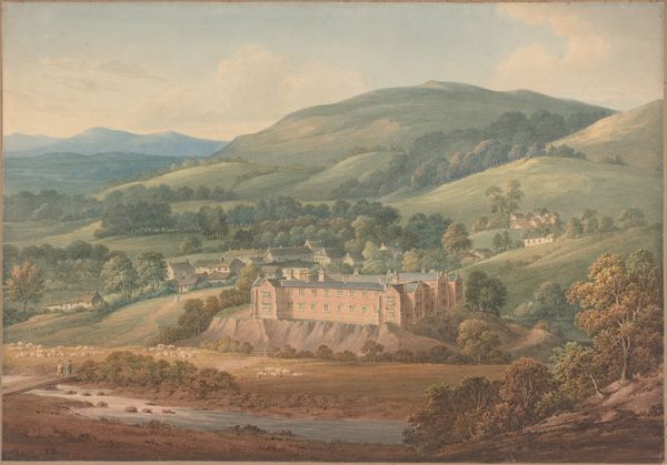 Elizabeth Murray’s watercolour, ‘Country Manor House’, presents a picturesque landscape imbued with tranquility. The composition is structured around a play of horizontal and vertical lines, balancing the natural forms of rolling hills and trees with the architectural solidity of the manor house. The subdued palette, dominated by greens, browns, and soft blues, evokes a sense of pastoral harmony. Murray’s delicate brushwork captures the textures of stone and foliage, while the strategic use of light and shadow creates depth. The house is framed by a network of trees and set against a backdrop of a softly rendered mountain. The building, with its tower, is a clear signifier that suggests stability and order. The landscape is organized to offer a controlled, almost curated vision of nature. This structure reflects a broader cultural desire to impose order on the natural world, transforming it into an aesthetic ideal. In that sense, Murray’s watercolour invites us to consider the intersections between nature, culture, and representation.