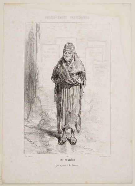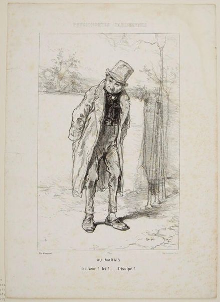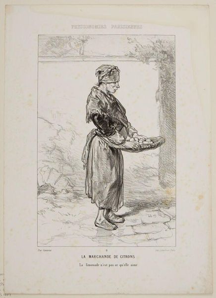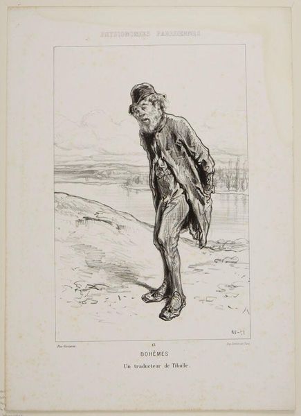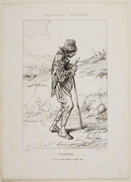 Editor: This is Paul Gavarni's "Quarryman". The figure seems burdened, almost stoic. What symbolic weight do you see in his portrayal? Curator: Note how the figure's pose mirrors the landscape's desolation. The pipe, perhaps, a symbol of fleeting comfort against the harsh reality of his labor. It also speaks to the continuity of labor traditions and their impact on the individual psyche. Editor: That's interesting. So, the pipe is more than just a pipe? Curator: Indeed. It echoes the burdens carried through generations, doesn't it? It reminds us that images often hold unspoken histories. Editor: I hadn't considered the multi-generational aspect. Thanks!