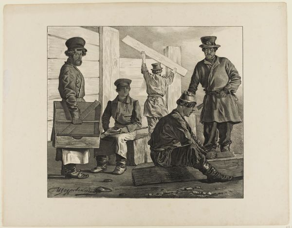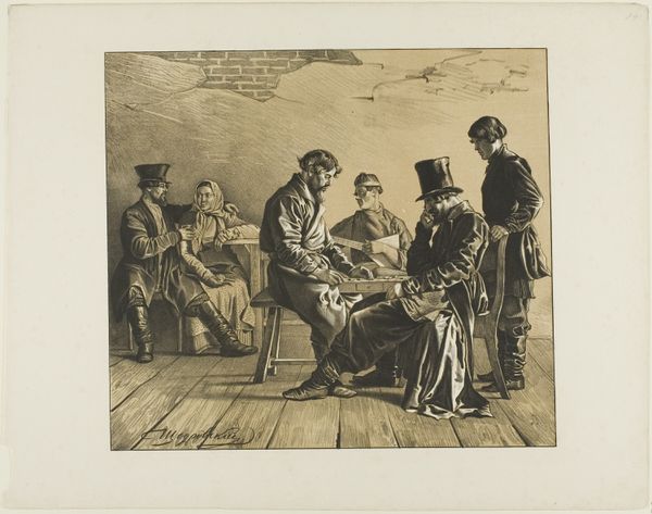 Editor: This lithograph, "Scenes from Russian Folk Life," is by Ignatii Stepanovich Shchedrovskii, and its date is unknown. I am struck by the expressions on the men's faces – some are pensive, others seem intensely focused. What can you tell me about this piece? Curator: It certainly offers a glimpse into a world laden with tradition. Notice the clothing – the boots, the hats, the layered garments. These are not just articles of clothing; they are badges of cultural identity, whispering tales of social status and regional belonging. The table around which they gather, what might that represent? Editor: Maybe community and connection? Shared activity? Curator: Precisely! Consider the shared ritual happening there – perhaps a game or a crucial decision being made. These symbols reflect larger social dynamics at play. Who holds the power? How is it expressed? The artist prompts us to think about how symbols and actions encode profound cultural meanings. What does that stark wall convey, absent adornment, lacking in any detail? Editor: Perhaps a sense of austerity, maybe reflecting the realities of life for the people depicted. I guess every detail in this scene, no matter how small, acts as a kind of cultural marker. Curator: Absolutely. Every carefully rendered detail, even seemingly insignificant ones, tells a story, contributes to a deeper understanding of this scene and the world it represents. This is about more than just observation, but also unlocking an echo of cultural memory. Editor: Thank you, it’s amazing how much this artwork reveals about the daily lives and values of the people within it.