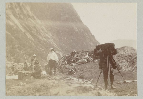 This photograph, titled "Wegwerkzaamheden en landmeten" and made by an anonymous artist, presents a scene dominated by earth tones and a structured composition. The horizontal lines of the terraced landscape contrast with the verticality of the figures and foliage, creating a sense of ordered development within a natural setting. The photograph's structure reveals a society imposing its will upon the landscape. The figures, arranged somewhat formally, suggest a blend of authority and labor, with their clothing and tools marking their roles within this transformation. The receding lines and muted palette evoke a sense of scale. This image does not merely document, but also participates in a broader discourse about space, power, and the imposition of human order on the environment. It invites ongoing interpretations about the relationship between progress and nature.