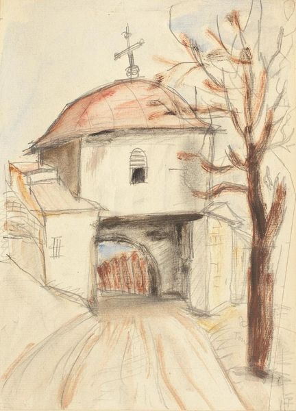 Editor: So, this watercolor by Stefan Dimitrescu is called "In front of the House." It's a simple, kind of quiet scene. The washes of color give it a soft, almost dreamy feel. How do you approach interpreting a piece like this? Curator: Note the deliberate arrangement of forms. The geometric simplicity of the houses, punctuated by the darker accents of the windows and doors, provides a structural rhythm. What effect does the artist create by using these limited color harmonies? Editor: Well, I think the limited palette, mainly earth tones and whites, creates a sense of harmony. Everything feels very cohesive and unified. The muted colors also contribute to the tranquility of the scene. Curator: Precisely. And observe the placement of the solitary figure in relation to the architecture. The scale and position relative to the buildings evoke feelings of intimacy. What would you say about the tension between representation and abstraction in this composition? Editor: That's interesting. The houses are clearly representational, but the loose brushstrokes and the way the colors bleed into each other definitely push it towards abstraction. It’s like he’s capturing an impression of a place, rather than a precise rendering. Curator: Indeed. Consider how Dimitrescu's approach is both descriptive and deeply personal, and the interaction of compositional elements creates balance and order, thereby guiding us to reflect on its aesthetic significance. Editor: It's fascinating how focusing on the structure and the visual language of the piece can reveal so much. Thanks for sharing that perspective. Curator: My pleasure. Every brushstroke tells a story if we learn how to listen to the language of form and color.