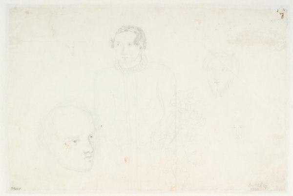 Editor: Here we have Washington Allston's "Three Sketches for the Head and Pose of a Woman." It's a small drawing, but it has such a pensive, almost melancholic feel. What do you see in this work? Curator: Notice how Allston revisits the same figure, slightly altering her gaze and posture. Each repetition acts as a symbolic layering of emotional states, reflecting an internal world. Can you sense the cultural memory embedded in these classical poses? Editor: I think so! I see a connection to Renaissance portraiture, but with a Romantic-era introspection. Curator: Precisely! Allston uses familiar forms to explore new psychological depths. This layering creates a powerful emotional resonance, hinting at timeless struggles and enduring human experiences. Editor: I never would have thought of that! Seeing the sketches as emotional symbols really changes my perspective. Curator: Indeed. Art often serves as a mirror, reflecting and refracting our shared human story across time.