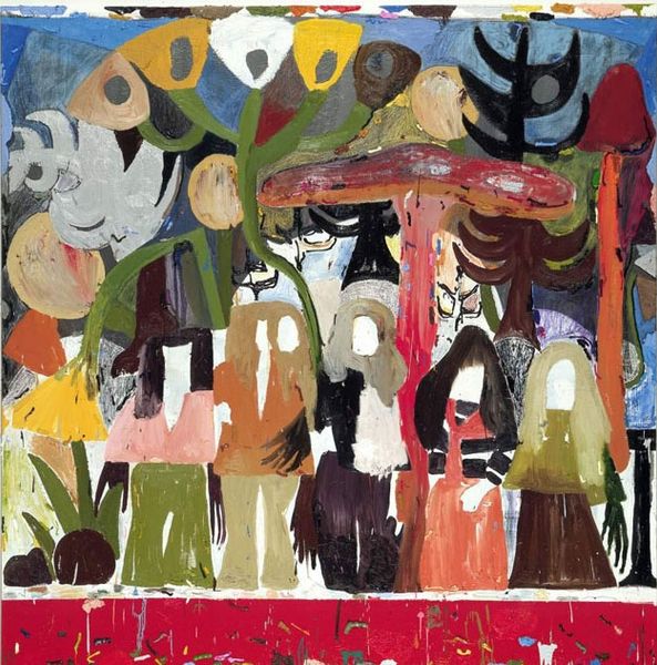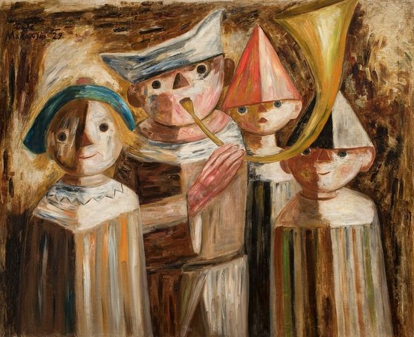 Tadeusz Makowski made this painting, Group of Children, with oil on canvas. The kids are lined up like they're posing for a class photo, or maybe it’s a lineup of suspects. Is that a landscape in the background or a wall? Makowski’s palette seems to be based on a limited range of browns, creams, off-whites, and greys. He also includes some jarring notes of cadmium red, cobalt blue, and Naples yellow, which really makes the picture glow. Looking closely at the texture of the paint, I can see that the artist really loaded his brush. The paint handling is chunky, especially in the background. He uses a dark wash of black and grey, which is dabbed, speckled, and scrubbed into the weave of the canvas, giving it the appearance of an atmospheric fog. It’s a great way of building up the image in layers. I think of Chaim Soutine and the way he applies paint with freedom and expression, but also, there’s something about the oddness and awkwardness of the figures that makes me think of Guston, too. Ultimately, it’s a painting that raises lots of questions, which is a good thing!