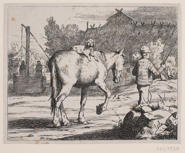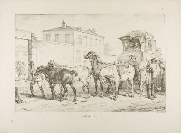Editor: Here we have Adolph Kittendorff’s “Skraldemandshesten,” a lithograph from 1845. I’m struck by the contrast – the formal attire of the man versus the labor implied by the horses and the cart. What elements stand out to you? Curator: Indeed, the pictorial structure is compelling. The interplay between line and space, specifically the dense hatching used to describe the man's coat compared to the relatively open rendering of the horses, establishes a visual hierarchy. Consider the verticality of the man against the horizontality of the cart – how might this opposition influence our reading of the work? Editor: I see what you mean. The lines direct my eye to the standing man, though I initially looked at the horses as the central figures. Curator: Precisely. Note the tonality achieved through the lithographic process. The artist masterfully manipulates light and shadow, creating depth and volume, particularly in the rendering of the horses’ musculature. The cobblestone street acts as a textural grounding, further enriching the visual experience. Do you see the same thing? Editor: Now that you point it out, I recognize that interplay of light and texture. I didn't consciously process how integral that was, I see now how the dark against light shows form. Curator: Yes, by carefully organizing formal elements, Kittendorff constructs a narrative far exceeding a simple genre scene. It becomes an exploration of societal contrasts, rendered through the specific language of lithography. Editor: That's given me a lot to consider in future lithographs I look at!