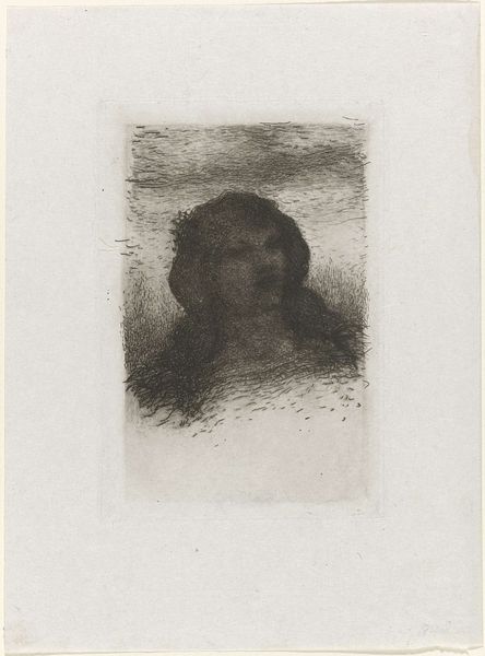 Curator: Looking at this subtle work, it's Joan Berg's "Hoofd van Meisje" from 1872, housed here at the Rijksmuseum. Made with etching, graphite, and ink on paper, it embodies the artistic sensibilities of its time. Editor: There's such quietness about it, isn't there? The softness of the lines almost makes it seem like a fleeting thought, a memory just out of reach. Curator: Absolutely. Berg, working within a period defined by strict social norms, captures this young girl with remarkable intimacy through relatively accessible methods. The mass-produced quality of prints like this speaks volumes about its dissemination within bourgeois culture at the time. Editor: You know, when I consider the materiality, the etching technique used—the way the lines create the image—it feels very labor intensive for such a small artwork. How does the manual labour aspect of its production challenge, or reinforce, ideas of 'high art' versus craft in its period? Curator: Good question. The realism evident challenges academic traditions dominant in fine arts institutions of that era. Prints democratized art, placing it within reach of middle-class consumption. The very accessibility challenged notions of art existing exclusively for the elites. Editor: This almost looks more like a sketch for a larger composition, or even an intimate glimpse that subverts any idea of staged portraiture as it allows for a view on private lives that wouldn’t be readily available to broader audiences otherwise. How would period exhibitions have framed pieces like this—would there have been any tension present because of it? Curator: It depends on where it was exhibited. In a private gallery, possibly not so much, as it would be tailored to its cultivated clientele. In larger institutions there may have been, especially those trying to negotiate art historical lineages while expanding public engagement. Editor: I never cease to marvel at art’s inherent duality: existing both as an object of consumption and also acting as silent commentary on social mores. Curator: A wonderful point. Perhaps we are now seeing why this work retains such emotional impact centuries on.