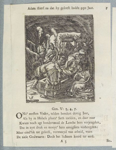 Curator: Let’s consider this intriguing engraving by Christoffel van Sichem II, entitled "Selectie van Gideons manschappen," dating approximately from 1645 to 1740. It's currently held in the collection of the Rijksmuseum. Editor: Immediately striking is the stark contrast and tightly packed composition, a kind of unsettling dynamism given the subject. What draws me in are the intricate lines. Curator: Yes, the artist’s focus on line work creates a narrative density. This piece illustrates a moment from the Book of Judges, where Gideon tests his troops at the water to identify the most alert and ready for battle. This biblical story speaks to the themes of divine selection and military strategy, but it also subtly engages ideas around faith, obedience, and power structures within the Old Testament context. Consider how interpretations of Gideon's story have shifted across various sociopolitical landscapes. Editor: True, it speaks of testing fidelity and readiness but also creates an image-space with great tonal contrast: The texture of the trees and musculature, the detailing on the armor, create layers of depth despite the lack of color, all held by that central figure holding what seems to be a spear and a very pronounced gaze toward the viewers. What could be the intentions or underlying motives within the line composition choices? Curator: Certainly, that focused gaze encourages viewers to confront their own roles in power dynamics, questioning obedience to higher authorities. Think of it as an examination of societal selection processes. The distribution of shadow and light plays upon contemporary societal understanding around divinely chosen people during war events or great displacement era, emphasizing themes of discernment in perilous circumstances, of divine will shaping outcomes during war times and conquest. The engraver used stark light, contrasting shadows as commentary on inherent bias. Editor: So, through the lines themselves, the image constructs not only depth but an assessment on the act of watching—that is an incredibly precise use of materials. What does it imply for art during war to emphasize looking so sharply? Curator: Well, such use might prompt considerations on media representations' capacity to legitimize/perpetuate conflict and narratives during periods defined war within sociopolitical domains or moments and environments framed historical accounts about conflict, therefore challenging notions prevalent. Editor: An artistic act to observe critically, even through old narrative tropes.