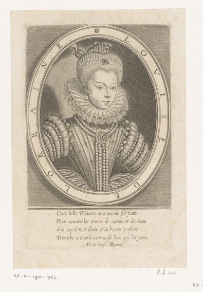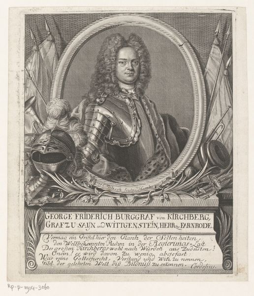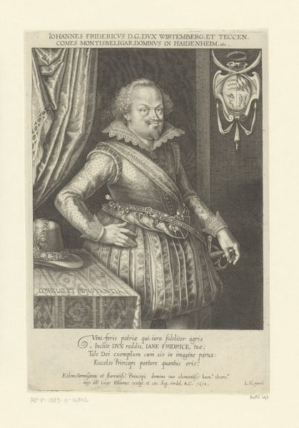 Curator: Before us we have a print identified as "Portret van Johann Friedrich von Württemberg" made sometime between 1608 and 1637. The artist is Lucas Kilian. Editor: The visual impact is remarkable, particularly the intricate details achieved through engraving. It really speaks to the craftsmanship of the time. The lines almost vibrate with life, a symphony of shadow and light that gives a weighty three-dimensionality despite the flatness of the page. Curator: Considering the era in which Lucas Kilian operated, the work has to be understood within the complex political and social dynamics of the Holy Roman Empire. The detailed rendering of Johann Friedrich von Württemberg’s attire is a demonstration of power and status during the late Renaissance and early Baroque periods. What does his elaborate clothing convey in relation to his status? Editor: The oval composition contains the essence of representation – a deliberate choreography between form and message. See how the lines of the engraving guide our eyes towards the central figure. It's a masterful construction to evoke dignity and authority, isn’t it? Curator: It is worth noting the role of portraiture in shaping dynastic narratives. Kilian’s print undoubtedly played a role in constructing the image of Johann Friedrich within the context of his rule. His depiction advances certain claims about legitimate power through an aesthetic language available to a wide audience through print culture. Editor: The rendering is very evocative in terms of form, but the portrait could be almost any nobleman in the period. Still, you’ve moved my perspective, I see beyond a man of status and notice now a crafted image for social purposes. Curator: Precisely! I see Kilian’s work not just as an image but as an important visual component to Württemberg’s power and persona. I'm interested to examine further into how he may have been influenced by the religious tensions and intellectual debates of the 17th century Editor: Perhaps examining Kilian’s strategic arrangement of lines can lead to greater insights on the aesthetic goals of the period, while your approach may enlighten us about their ideological functions within early modern European society. Fascinating.