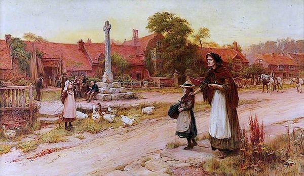 Editor: This is Laslett John Pott’s “Life is Like a Sundial” from 1878, rendered in oil paint. The painting shows a family gathered around a sundial in a garden setting, and the whole scene gives off a sentimental, idyllic feeling. What societal values might have influenced such a scene? Curator: This piece speaks volumes about the Victorian era's emphasis on domesticity, leisure, and moral lessons, often conveyed through sentimental imagery. The inclusion of a sundial invites reflection on time and mortality, common themes in Victorian art, hinting at fleeting beauty and the importance of living a virtuous life, didactically offering life advice, much like many of the works that appeared at the Royal Academy. Editor: So, its value comes from reflecting social norms and values? Curator: Exactly! Paintings like this were deeply intertwined with the social and cultural landscape of the time. Consider the peacock, for instance; it signifies beauty, pride, but also ephemerality and was an icon within aestheticism. Think of how the art market operated; success was heavily reliant on appealing to middle-class sensibilities and often depicting scenes of moral virtue. Editor: I hadn't thought about the art market's influence so directly! Curator: Museums and galleries of the era heavily shaped what art was consumed and valued. Paintings which evoked strong narratives or reaffirmed societal values found ready audiences and critical acclaim. Consider also the painting's title – how does that reinforce its intended reception by the Victorian public? Editor: It points you directly to interpret this as a symbol of life. Interesting. I now understand the piece far beyond its aesthetic appeal. Curator: Indeed, viewing art through a historical lens allows us to understand it as part of broader cultural conversations. Editor: I see now how this work operates as both a personal reflection and a statement on public morals. Thanks for that deeper understanding.