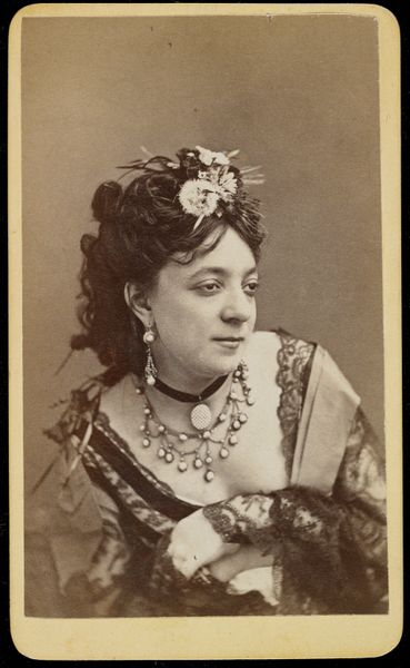 Curator: The somber mood in this portrait immediately strikes me; there’s a real weightiness in the subject's gaze and posture. Editor: Indeed. Let's delve deeper. What we have here is an albumen print entitled "Pensive," created in 1893 by Pierre-Louis Pierson. It currently resides at the Metropolitan Museum of Art. Pierson was known for photographing influential women of the time, often actresses or members of the court, placing them in constructed tableaux. Curator: Looking at it now knowing that it's staged, it gives the portrait another layer. Who is this woman performing pensiveness for? It feels melodramatic. Editor: The melodrama may not be unintentional. Photographic portraits in the late 19th century became closely tied to celebrity culture. Women specifically had certain expectations to embody; they often mirrored archetypes in art or literature, therefore dictating what emotion or sentiment a female figure *ought* to embody and project for the public. Curator: Right. It calls to mind questions about performance and self-representation, especially within the confines of societal expectations placed upon women at the time. You have to wonder what the power dynamics were like, both between the artist and his subject, and how photography impacted them. How much agency did this woman *really* have in curating her image? Editor: Well, that’s precisely where institutional history comes in, as this photo shows not just Pierson’s skill, but how deeply entrenched image making had become with celebrity and female personas. These types of portraits, circulated widely, helped solidify cultural ideals that women often struggled to both embody and break free from. Curator: Thank you. Considering all of this truly enriches our perception. The melancholic atmosphere makes far more sense with this contextual awareness. Editor: Yes, I'm more informed now, recognizing it both as an aesthetic and a document that embodies and perpetuated prevalent ideologies.