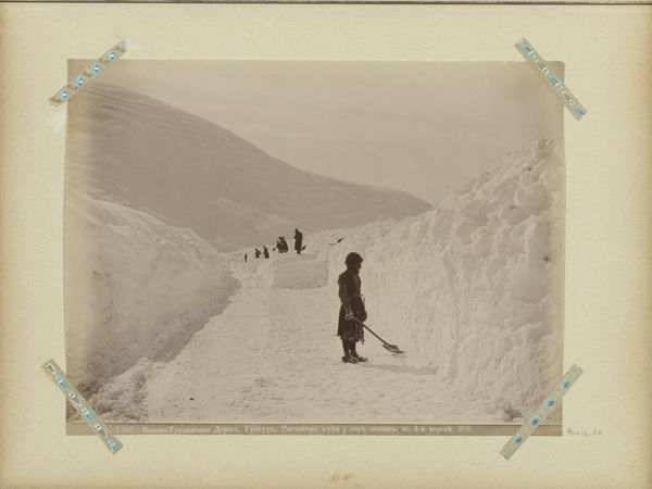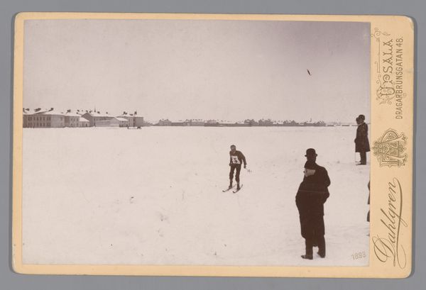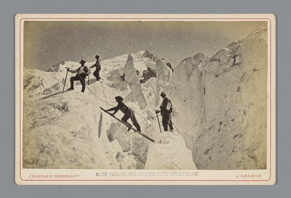 Curator: This gelatin silver print, created around 1891, captures a group portrait amidst a strikingly icy landscape near Nijmegen, Netherlands. The photographer, Gèrard Stoof, presents a scene where figures seem both at ease and precariously perched on the frozen terrain. Editor: It immediately strikes me as stark. The limited tonal range—almost monochromatic—lends it a dreamlike, ethereal quality. The figures are dwarfed, nearly consumed by the expanse of white and grey, making the group appear almost spectral against the ice. Curator: Absolutely, and consider the historical context. Landscape photography was developing rapidly, capturing the public's fascination with scenes both ordinary and extreme. These kinds of images documented local events, even harsh winters, while serving as promotional tools, illustrating Nijmegen and its surrounding area. Editor: That’s fascinating, because ice carries potent symbolic weight. It speaks of transience, risk, but also communal strength. This isn't just a winter scene; it’s a potent visual metaphor for a community confronting the unpredictable nature of their environment, almost a symbolic challenge overcome through sheer social cohesion. Look how their poses, however stilted by photographic conventions, radiate an underlying unity. Curator: A perceptive observation! The clothing of these figures provides valuable clues too. Their attire gives us insights into societal ranks; it is clear that we are not looking at workers but men from Nijmegen who belong to the upper class of society, maybe a fraternity. Editor: Yes! Each detail serves almost as a visual anchor to this era: the style of dress, the setting and their interaction; this evokes themes of perseverance, unity and control over the physical realm that go much deeper than being mere markers of a certain group and the landscape it occupies. It is a testament of endurance and shared identity of these men against a background of a harsh reality Curator: Well, on balance, this photographic composition, blending human portraiture with elements from nature in challenging settings provides a multi-layered perspective on the past. Editor: Agreed. And while photography is of course the objective visual capture, it shows also, beyond the visible spectrum of facts, powerful elements about resilience and symbolism.