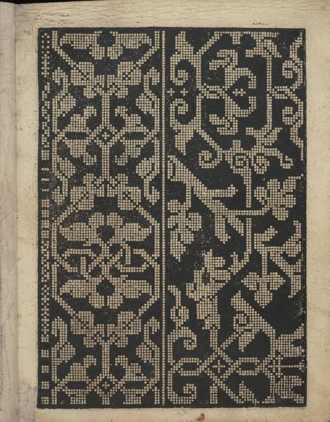 Editor: Here we have "Ornamento delle belle & virtuose donne, page 9 (verso)" created in 1554 by Matteo Pagano. It is a drawing rendered in ink. The sheer repetition of shapes is hypnotic! How would you interpret this work, looking at the artistic decisions within the piece itself? Curator: Thank you. Focusing on formal qualities, observe how Pagano structures this page using contrasting textures and rhythmic patterns. Notice the interplay between the densely packed geometric motifs and the relatively open, curvilinear design on the left border. Semiotically, we can see how these contrasting elements generate a sense of visual balance and structural integrity, don't you agree? Editor: I see that! The geometric grid is the dominant structure, creating a foundation for everything else. So, it's less about subject and more about... visual mechanics? Curator: Precisely. Consider the material quality of the print – the stark contrast of ink on paper. This binary opposition serves to highlight the precision and intricacy of the design. The composition relies on a calculated use of positive and negative space, compelling our eyes to dance across the surface, continually discovering and decoding patterns. The grid becomes a field of visual information, doesn't it? Editor: It definitely shifts how I see it! So it's a study in structured visual relationships – not necessarily telling a story, but creating a visual language of its own. Curator: Precisely. By analyzing form, composition and materiality, we decode a network of structured visual elements. Ultimately we engage with the artwork on its own terms. Editor: Thank you. Thinking about art this way provides a whole new perspective on image creation, understanding the core foundations of structure.