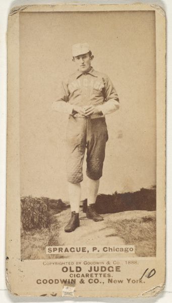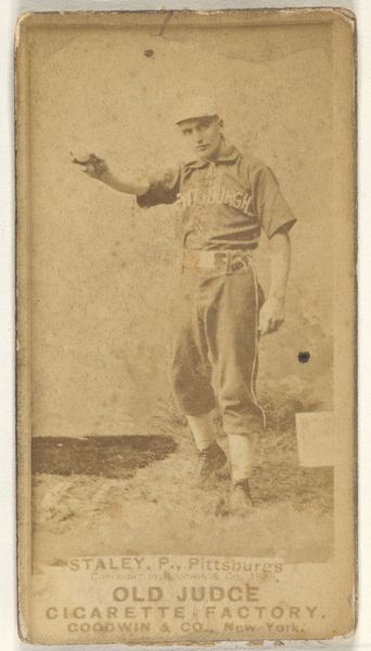 Curator: This photographic print is entitled "Staley, Pitcher, St. Louis Whites," and it hails from the "Old Judge" series of 1888, a promotional item for Old Judge Cigarettes. Editor: There's something incredibly tender about this image; a quiet sense of poised anticipation. His gaze seems locked onto something unseen, almost like a dance of focus about to explode into action. The sepia tone gives the work a soft, nostalgic feeling. Curator: Note how the artist utilizes a stark frontality, almost confronting the viewer. This orientation presents Staley not just as a baseball player, but as an individual to be regarded. The use of light and shadow, though minimal, defines the contours of his face and physique, rendering him almost sculptural. Editor: And how Staley holds the ball! It’s a gesture pregnant with symbolic weight. In this instance, it transforms the baseball into an emblem of fate, choice, and possibility; holding the promise of success or failure. He's caught in this beautiful state of potential energy. Curator: Certainly, it also mirrors a tension intrinsic to the era of its creation. Consider the formal, almost rigid pose, which would have appealed to late 19th-century sensibilities. At the time of baseball's rising popularity, promotional photographs played a key role, carefully crafting an idealized version of a modern sporting hero for an enthusiastic audience. Editor: I find it poignant. He's more than an athlete caught mid-motion; Staley symbolizes aspirations. His pose communicates diligence and purpose. It speaks to this country's early love affair with heroes, as captured through iconography both commonplace and quietly dignified. Curator: From my perspective, what stands out is its synthesis of form and context. Without one another, neither could communicate the sense of aesthetic balance, rendering the artwork complete. Editor: I am struck that there is something almost spiritual, too, when pondering our fascination with baseball heroes frozen within a sepia time capsule. The composition encourages viewers toward personal reflections on heroes both celebrated, as well as those unnamed.
