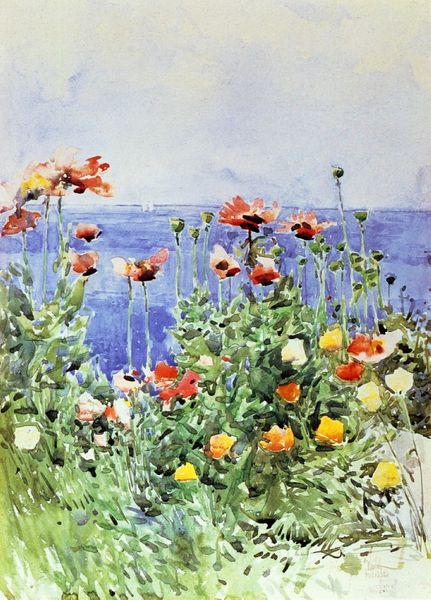 Curator: Here we have Childe Hassam’s "Home of the Hummingbird," a watercolor from 1893. What's your immediate take on this garden scene? Editor: I'm immediately struck by this sense of enclosed serenity. The vibrant splashes of reds and greens nestled within this soft, muted light feels comforting. Like finding a secret garden. Curator: Absolutely. Hassam masterfully employs impressionistic techniques here; notice how the boundaries soften. The structural rigidity of the fence and gate fades into a background mist of blues. The eye wanders and roams unrestrained. Editor: That dissolution of form—it’s interesting you mention the fence because its horizontality anchors the vertical energy of the taller plants, which leads us up into the painting. So although dreamlike it still uses solid principles. It isn't a total wash of colors or emotion; it’s directed. Curator: The loose brushwork characteristic of plein-air painting lends itself well to this image, it has an ethereal quality that complements his exploration of light. I like to think of Hassam capturing fleeting moments, trying to freeze something ephemeral. And here it feels successful. I get a sense of peace but one slightly fading from our reach, nostalgic. Editor: You nailed it—there's something incredibly transient about watercolor, right? The fluidity mirrors that fleeting moment, almost slipping through our fingers if we try to hold it too tightly. It is perfectly paired with the emotional themes within "Home of the Hummingbird." It hints at stories untold in blooms on the verge. Curator: And that whisper of narrative—those beckoning walkways that are disappearing as well. So interesting to see the objective formalist view dance so nicely with subjective and emotional takes! Editor: Definitely makes one consider a new perspective when walking away from the scene as well, doesn’t it?