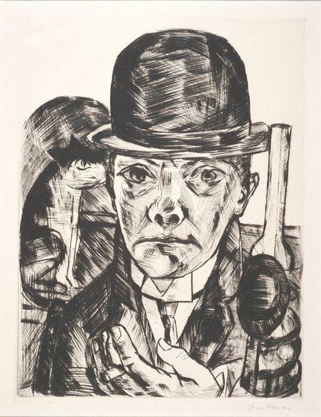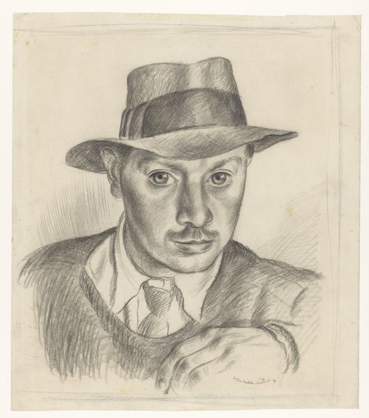 This is a self-portrait by Alexander Zerdin Kruse, and it looks like he made it using graphite on paper. You can see the hand of the artist in those marks. It’s not about hiding the process, but letting it sing. Looking closely, you’ll notice how the texture of the paper comes through, especially in the lighter areas. The way he's built up the shadows around his eyes and hat is amazing. Each stroke feels deliberate, almost like he’s mapping his own face, turning it into a landscape of experience. See how the lines around the mouth curve and suggest a quiet knowing? This reminds me of the portraits by Käthe Kollwitz, who also used printmaking to explore the depths of human emotion. Like Kollwitz, Kruse isn't just showing us what he looks like, he's inviting us to contemplate what it means to be seen, to be known, and to see ourselves in the eyes of another. It's a conversation across time, a shared exploration of what it means to be human.