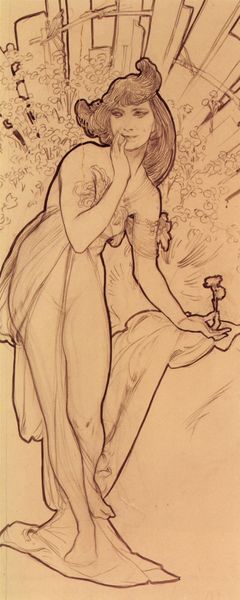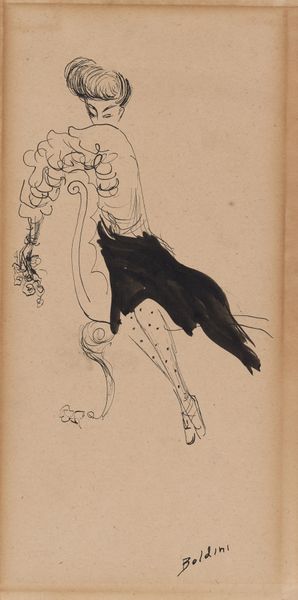 Editor: This is "Wreath Bearer," a design for the Viennese Secession building's facade by Koloman Moser, made around 1897. It's an ink drawing of a figure, and what strikes me is how much it looks like an advertisement. What's your take on this, particularly regarding its context? Curator: I think your observation is spot on! It’s crucial to consider that this wasn’t simply a drawing, but a design *intended* for architectural reproduction. It brings up questions of artistic labour, specifically Moser’s. Was it considered "high art" at the time, or a commercial sketch? The planned repetition and mass consumption as decorative facade elements are vital aspects to consider. How does that inform your understanding of its purpose? Editor: Well, knowing that it was meant to be repeated changes things. It seems like it blurs the line between fine art and functional design. It feels almost…proto-industrial. Curator: Precisely. The Secession movement challenged these very divisions. Materials were just one step in the total work of art or gesamtkunstwerk as Wagner called it, dissolving conventional artistic hierarchies. Consider the labour involved, too. From Moser’s design to the execution on a building, many hands would have replicated his image, which would itself have become part of the architectural production and consumed via visual culture. It brings materiality right into focus. What kind of audience was going to "consume" it visually everyday, and how did this change their lives in material ways? Editor: I hadn't really considered all of those levels of labour and materiality. Thinking about it this way, it becomes less about just the image and more about this whole network of production and consumption. Curator: Exactly. And those economic and material relationships really shaped the cultural impact of the work, right? It’s about thinking beyond the surface. Editor: Definitely gives me a lot to think about regarding how we define and value "art." Curator: Indeed, and that constant questioning keeps it alive, I feel.