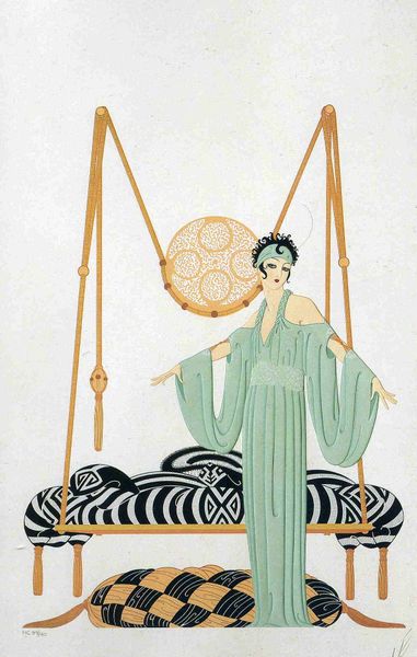 Curator: Look at the dramatic flair in this artwork, titled "Athena" and attributed to Erte. It's striking, wouldn’t you agree? Editor: Yes, a study in controlled artifice. The palette, the smooth curvature against the hard-edged fan, evoke a sense of aloofness, almost mechanical elegance. Curator: Precisely. Knowing Erte’s background in fashion design, you can see how commercial reproduction impacted his art-making; the drawing and watercolor on paper became easily reproducible images that reflected popular interests. What do you observe in the character’s garb and stance? Editor: Well, the long gold robe—with its stylized drapery that hugs every curve—alongside the peacock fan held in her hand suggest an ethereal divinity… There’s a flattened picture-plane, too, making us very conscious of surface and design rather than depth. Curator: Consider too how Erte, being a Russian-born French artist who spent considerable time in America, created costume and set designs in Hollywood and stage productions, becoming part of that circuit of cultural and visual influence, reaching widespread audiences via various magazines like "Harper's Bazaar" and "Vogue." How does the print impact popular notions of status? Editor: That’s it—his artistic roots within commercial work are visible! Erte simplifies the goddess’s appearance by making use of geometrical structures and clean lines while evoking the power and refinement connected to a bygone upper class; we observe idealization of beauty but rendered devoid of much personality or humanness. Curator: We should remember the process of making, its relationship to consumer culture, to fully appreciate its status. So many things that come out of a collaboration across different media can come off a different production line, right? The rise of advertising created these connections across diverse disciplines. Editor: True enough; by framing “Athena” as a reflection of not only Erte’s technical capabilities, we both acknowledge and expand his overall visual lexicon! Curator: A most intriguing piece that continues to hold relevance. Editor: I quite concur; its decorative beauty offers rich avenues of interpretation.
