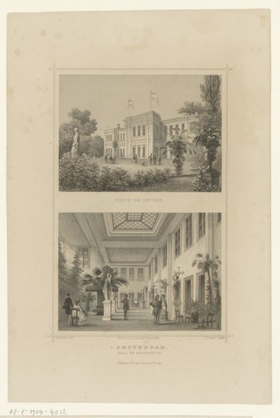 Editor: This print, titled "Twee gezichten op de Nederduitsche Academie van Samuel Coster aan de Keizersgracht in Amsterdam" by Lubertus Teunis van Deth, likely created sometime between 1824 and 1875, shows two views, one of the building’s exterior and another of the interior stage. It has a documentary feel, a historical record of a place. What do you see in this piece, in terms of its cultural resonance? Curator: The immediate impression is one of civic pride and cultural ambition. Note the prominent placement of the Academy along the canal, suggesting its centrality to Amsterdam's identity. Consider the symbols implicit in the building itself - the architectural choices and even its visibility from the canal - these were deliberate statements about knowledge, progress and public engagement with the arts. Do you see a connection between the outside and inside spaces, beyond their architecture? Editor: Well, both seem quite orderly and structured, with an emphasis on perspective. The exterior shows a busy but composed scene along the canal, while the interior highlights the stage's design. Curator: Exactly. The theater itself, presented with such care, emphasizes its role in shaping cultural memory. The architectural rendering displays social memory, literally. And by immortalizing it via engraving it points toward posterity. What purpose do you think these prints served beyond pure documentation? Editor: Perhaps as a way to promote the academy and celebrate its significance, by creating affordable reproductions of its image. Or possibly even to act as souvenirs! Curator: Yes! Printed images circulated ideas and aspirations. This engraving preserves more than a building, it speaks of intellectual life and cultural inheritance. Looking at it, we too, become heirs of that tradition, now. Editor: It’s fascinating how a simple print can reveal so much about a society's values. I'll certainly look at cityscapes differently from now on. Curator: Me too. Thank you for helping to excavate and re-inhabit its embedded meanings.