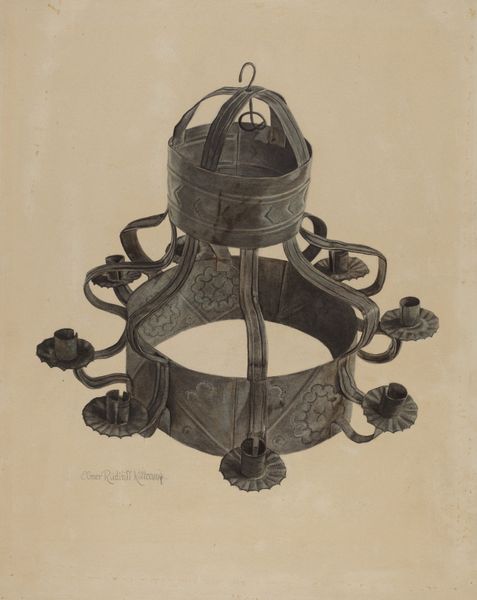 Milton Grubstein created this Lard Oil Lamp, using graphite or charcoal on paper. This isn't about high art materials; it's a study of an everyday object. Consider the subject matter itself: a lamp designed to burn lard, an animal product, for light. It speaks to a specific moment in history, before electricity became commonplace, when resourceful means of illumination were essential. The medium perfectly captures the lamp's cast iron construction, giving a sense of its weight and solidity. Grubstein's meticulous rendering highlights the lamp's design – a simple cylindrical reservoir atop an ornate, cast-iron base. The drawing captures the labor involved not only in producing the lamp itself, but also in the industries of animal rendering and metalworking that made it possible. By carefully documenting this utilitarian object, Grubstein elevates it to a subject worthy of artistic attention, blurring the lines between craft, design, and fine art. It reminds us that even the most humble objects can tell compelling stories about labor, resourcefulness, and the ingenuity of everyday life.
