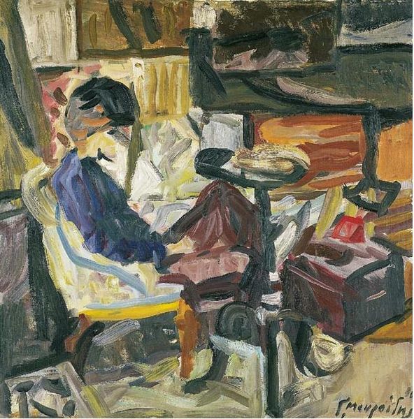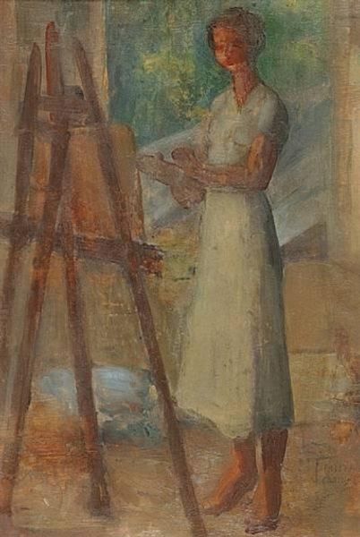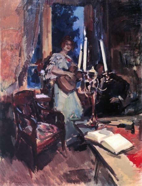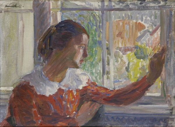 Curator: Walter Battiss captured this intriguing domestic scene in 1945, with the oil-on-canvas painting he called "Portrait of the artist's wife, the artist Grace Anderson." Editor: My first impression is quiet solitude; the palette feels muted except for that surprising burst of flowers. Curator: Battiss seemed so enamored of his wife, depicting her not just as muse, but a fellow creative mind – it feels so heartfelt. The domestic symbolism, of course, is ripe for exploration... her sewing implying creation and craft? Editor: Definitely! That spinning wheel practically screams of cyclical time, domestic ritual, and even perhaps a hint of mythological associations with fate and the turning of destiny’s wheel, doesn’t it? Curator: Ooh, that's delightful! See, to me it just evokes a sense of gentle, homespun routine and Grace's place in the centre of it all... It is easy to wonder how the personal and intimate intersect. As fellow artists, was there harmony or creative competition in their life together? Editor: You see a home, I see echoes of a broader cultural narrative surrounding women's roles and their confinement to domestic spaces – a symbolic framework laden with expectation and potential suppression. Though those flowers are like a rebellious shout. Curator: A beautiful disruption of the canvas! Do you know, her expression makes me wonder. There's an inward gaze, and is it my imagination, or does a very tiny brushstroke of sadness flicker about the corners of her mouth? Maybe she’s just thinking about her next artwork! Editor: Ah, there you go again with your hopeful gaze. She could just have something in her eye. But thinking of all the coded images of domesticity this conjures up has definitely offered food for thought. Thanks! Curator: And you have helped reveal further layers of meaning; it just speaks to the idea of seeing art as an unending story. It has been enlightening to examine how, sometimes, the most seemingly intimate subjects may hide great treasures.