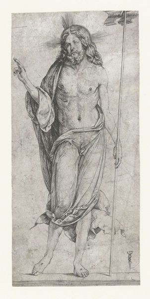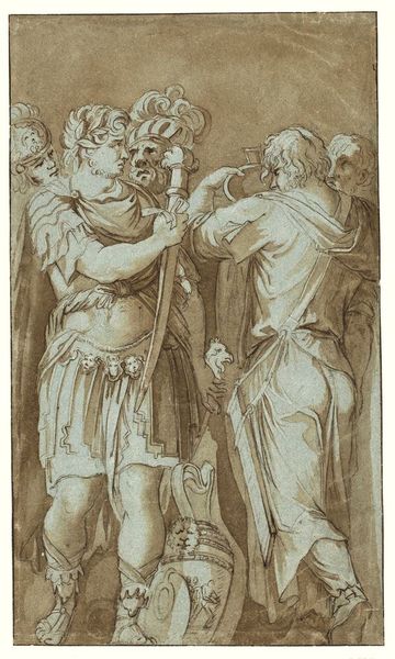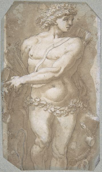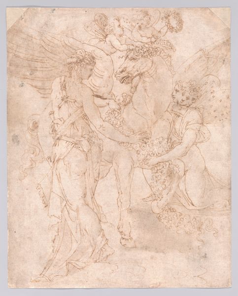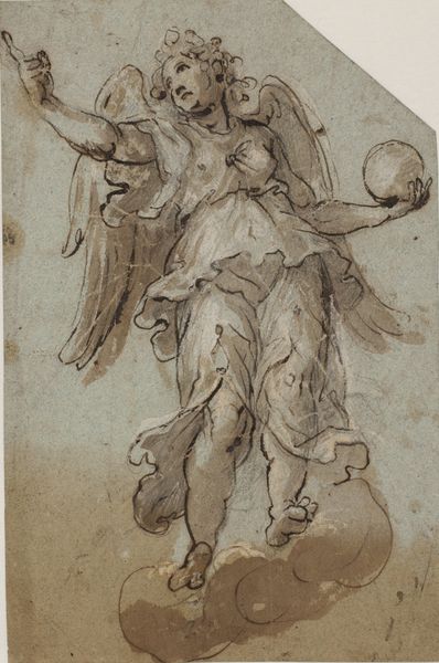 Editor: This is Guido Reni's "St. Michael Archangel and the Devil," a drawing that appears to be rendered in charcoal and chalk. It gives me the sense of preparatory sketch, full of movement. What do you see in it? Curator: Immediately, I observe the dynamism achieved through the stark contrast in shading. The robust figure of St. Michael is skillfully illuminated, set against a more gestural depiction of the defeated Devil. Consider how the lines, predominantly diagonals, contribute to the feeling of forceful descent. Editor: I see that too! The Archangel seems almost frozen mid-strike. But what does that say about the function of this piece, in relation to the intended meaning or interpretation? Curator: Functionality need not preclude meaning. We see an exploration of form and light— a formal exercise. Observe the artist’s anatomical precision juxtaposed with looser renderings; Reni seems preoccupied with the fall of drapery, and musculature rendered for the divine subject. Do you agree this formal juxtaposition is what dictates its lasting quality? Editor: Yes, the treatment of the body is interesting, but do you think that maybe we're missing out by overlooking possible iconographic components related to morality? Curator: The immediate reading aligns with the Archangel's triumph of good over evil, but this interpretation doesn’t come from outside its form, but only after a close consideration of line, and tone that establishes clear distinction of saint from sinner, thus rendering him more divinely noble than Devil. The composition guides the meaning through contrasts. Editor: I understand now, that by carefully evaluating its lines and the ways they are constructed, we can see that those compositional features guide the ultimate meaning, that are revealed just by form. Curator: Precisely! Close inspection enables a robust evaluation of form and function and their relation to each other.