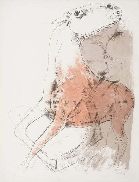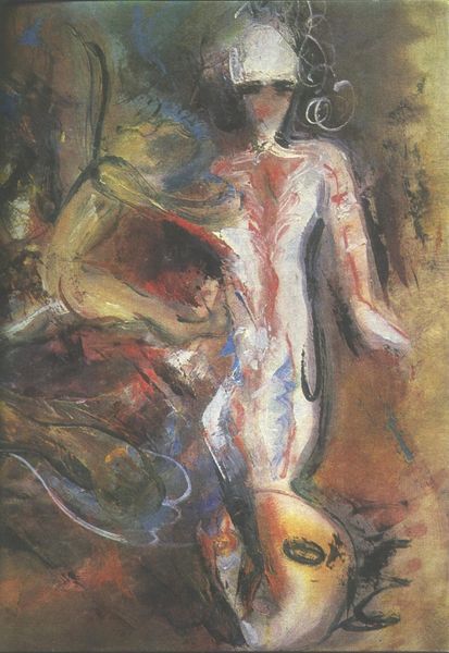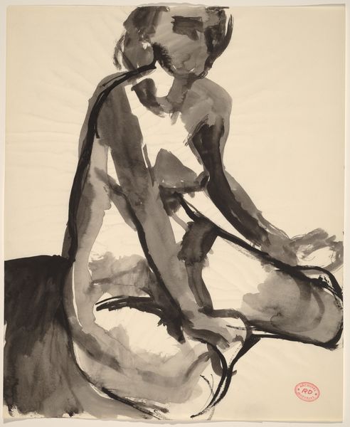 Curator: Aurel Cojan created this piece titled “Personnages” in 1964 using ink and watercolor. Editor: There's an immediacy to the piece – it feels less about meticulous detail and more about capturing fleeting expressions. The wash of colors gives it a dreamy quality. Curator: Observe how Cojan uses line weight and selective washes of color to delineate form. The composition favors suggestion over precision, challenging the viewer to complete the figures. What do you notice about the relationship between the figures in terms of the visual structure? Editor: I find the contrast between the darker figure in the background and the lighter, seemingly nude, figure in the foreground compelling. It brings forth allusions of guardianship or possibly hidden truths. Note the slightly awkward but poignant gesture of the raised arm – there seems to be a sense of silent reaching. Is there more here? Curator: The raised arm could serve as a compositional device, drawing the eye upward and preventing it from settling on the denser, darker tones at the base. A masterful deployment of color theory if I may say so. The choice of watercolor and ink, mediums known for their fluidity, certainly reinforces the sense of impermanence or transitional moments that define the figuration movement. Editor: Do you think there's any intentional subversion in the application of color or, moreover, line work? It feels very much an exploration into the artist's inner mind. I cannot help but imagine the heavy implications for the setting and circumstances these persons inhabit. Curator: Considering the period, the almost ghost-like treatment could reflect a postwar preoccupation with trauma or the fragile state of human connection. What could have inspired the artist here is difficult to determine so many decades later, so it leaves the image very much open for interpretation based on purely internal perception. Editor: Precisely – visual signifiers echo and resound across the ages. I find it especially evocative, as if I had known this experience somewhere deep inside. Curator: A beautiful synthesis of form, material, and feeling; a truly intriguing work. Editor: It certainly sparks a reflective dialogue, bridging the artistic and the personal.