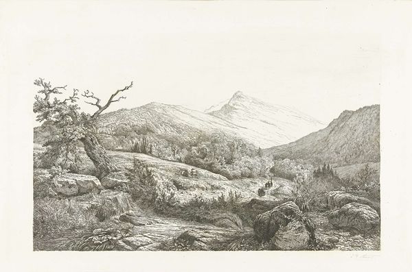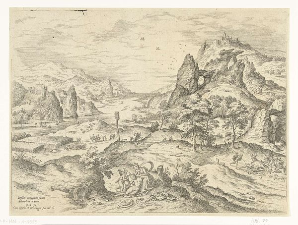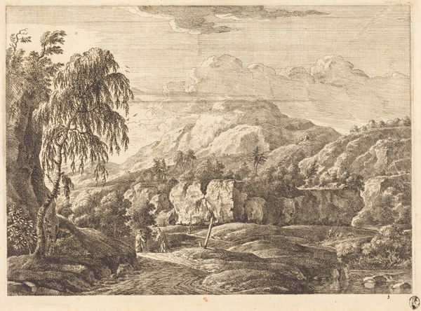 Curator: Before us is Gerrit Gauw's "Berglandschap," dating roughly from 1604 to 1638. This striking artwork is rendered with ink, through an etching process, showcasing intricate detail. Editor: The starkness of the monochrome gives it a rather austere quality, doesn’t it? The precision of line and the sheer topographical scope, are almost overwhelming at first glance. Curator: Let's consider the production; etching in that era demanded a high level of craftsmanship, layering technical skill with the social conventions expected for landscape prints. The labour invested really transforms cheap paper into something much more substantial. Editor: But look at how he uses those lines, really. It's more than representation—the diagonal hatching sculpts volume, and the differing densities create atmospheric depth, wouldn’t you agree? Curator: Indeed! And thinking about the distribution networks then; how these prints helped to convey a sense of landscape and place in a world rapidly connecting through trade, creating ideas around possession, trade and landscape as 'property' which Gauw as the artisan-creator would surely have engaged. Editor: Beyond geographical representation, that peak has almost a spiritual aura, accentuated by its solitary height, standing majestically at the artwork’s horizon line. Almost symbolic in its isolation. Curator: And it invites questions about the nature of artistic production and the labour practices within art history. It’s a vital link between economics and creative visual practice in the Netherlands, really, when thinking about what Gauw chose to reproduce. Editor: The sheer command of line creates a breathtaking image. You get such depth in the varying pressure of the ink across the etching. Curator: It presents some wonderful starting points for understanding the intersections between printmaking and economics within early modern Europe, the labour and circulation, definitely! Editor: I shall be thinking of depth and craftsmanship for some time now; those lines will not leave my gaze any time soon!