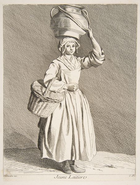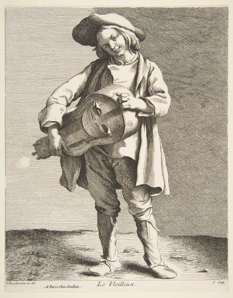 This print, made by Anne Claude Philippe Caylus, depicts a coppersmith from Auvergne, France. The most striking symbol here is the coppersmith’s tools—the very instruments of his trade, slung over his back and held in his hands. Consider how tools, across cultures and eras, represent human ingenuity and labor. They echo the Cycladic figurines with their tools, and medieval depictions of blacksmiths, where tools symbolize craft and creation. Yet, the coppersmith’s tools here, though practical, also hint at something deeper. The shapes, the way they hang, almost echo primal forms, stirring subconscious memories of past struggles and triumphs. The coppersmith's posture, the way he holds the pan, conveys both pride and weariness. It’s as if he’s carrying not just metal, but the weight of generations of labor, a visual testament to the enduring human spirit. Symbols are never static. They evolve. Here, Caylus captures a fleeting moment, yet embeds it with timeless motifs, reminding us that every image is a palimpsest, layered with history, emotion, and the echoes of our shared human experience.