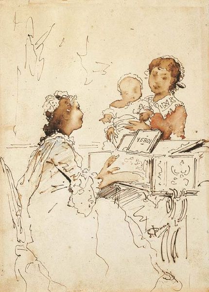 Curator: Looking at George Harvey’s "A Sonsy Armful," I'm struck by the quiet intimacy it captures. A mother cradling her sleeping child… there’s a sense of serenity. What’s your initial reaction? Editor: Serenity, yes, but also… vulnerability. Note the artist’s skillful rendering of light and shadow. It gives an impression of a fragile stillness, almost as if one deep breath could disturb the whole composition. There is a certain provisionality implied in the pencil work. Curator: Provisional indeed! Harvey seems to relish in sketch-like openness—the sense of transience mirrors how quickly time flies when you are a mother. This genre-painting isn't a static portrait but it encapsulates a transient instant. Do you perceive anything significant about Harvey’s use of line here? Editor: The linear network creates depth in intriguing ways—look, for example, at the implied volumes. Through strategic pencil strokes, and chiaroscuro the figures become more pronounced against an ethereal background. Note that Harvey signed the sketch at the bottom right of the image. This act confirms his endorsement of a sketch as a worthwhile artistic statement. Curator: Yes! I see so much affection embedded in this portrait. Harvey might have found that something special happens when you let go of hyper-realism to pursue the truth through more fleeting representations. Do you think we can read gendered subtexts in this artwork, considering motherhood as a classic subject? Editor: Certainly. One could unpack the composition through a feminist lens, interpreting the artwork through care ethics. The composition also contains an intergenerationality, with themes around birth and life implied via an eternal bond of nurture. Curator: In that case, how would you relate "A Sonsy Armful" to other portrait sketches? Is this artwork unique? Editor: Unique in its affective immediacy, certainly, although a strong throughline with similar Madonna paintings is apparent. Considering this lineage reveals much. Curator: It feels so rewarding when one small sketch invites us to weave personal insights with art history. Editor: It is true. When looking, what we choose to focus on often exposes as much about us as the artwork itself.