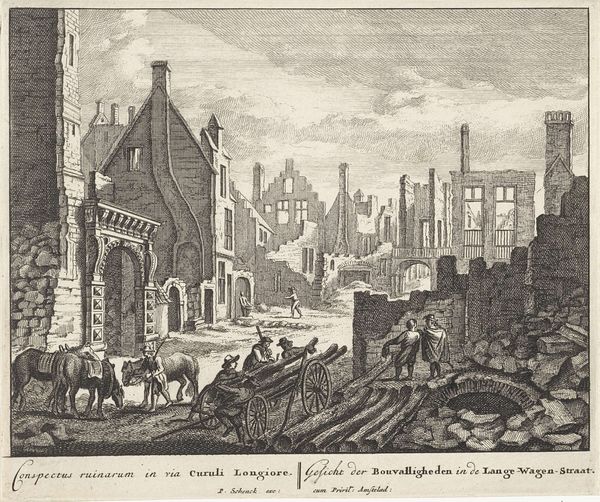 Pieter Schenk created this print, "Ruins in Brussels, 1695," using engraving, an intaglio printmaking technique. Lines are incised into a metal plate, often copper, using a tool called a burin. The plate is then inked, and the surface wiped clean, leaving ink only in the incised lines. When paper is pressed against the plate, the image transfers. The fine lines in this print capture the devastation of the city after the bombardment by French troops. The medium itself, engraving, mirrors the destruction seen in the image. The sharp, precise cuts into the metal plate echo the violent impact on the city's architecture. Prints like this one were often produced in multiples, making images of historical events accessible to a wider audience. They served as a form of documentation and a way to spread information, highlighting the relationship between art, society, and the dissemination of news. In this context, even printmaking can be seen as a kind of labor.