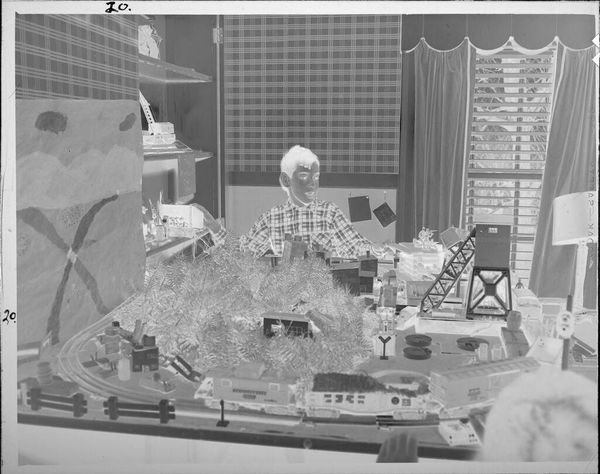 Curator: This is an untitled work by Hamblin Studio, showing the kitchen and sink area of Lee's Esso Grill. Editor: The composition immediately strikes me—a still life almost, yet with a haunting quietude. The inverted tones amplify the sense of stillness. Curator: Indeed. Consider the cultural significance of roadside diners in mid-century America. They represent a specific moment of accessible community. Editor: I see that reflected in the everyday objects—the stacks of plates, the utensils. They are imbued with the rituals of daily life and sustenance. Curator: Precisely. The Esso Grill, a space where people gathered, becomes a symbol of shared experience. These businesses created a culture of their own. Editor: And the inverted tones almost give it the quality of an X-ray, exposing the bones of the place. A ghost of the past, perhaps? Curator: An apt metaphor. It serves as a visual artifact of societal structures and their impact on the local level. Editor: It’s a reminder that even the most ordinary spaces hold layers of meaning, reflecting human interaction and cultural memory.