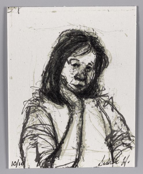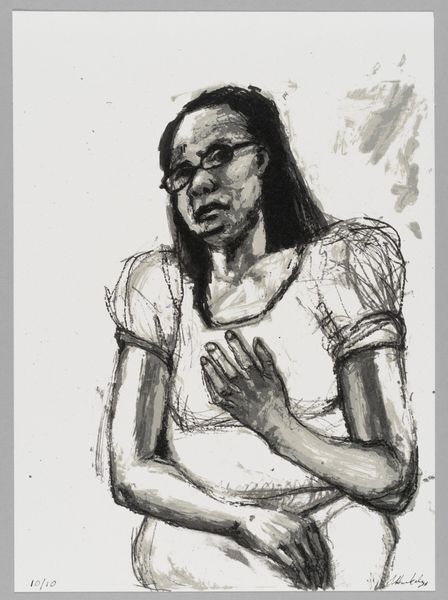 Curator: Looking at Sedrick Huckaby's drawing, "99% NO.11," one immediately senses an incredible intimacy. Editor: The immediacy of the sketch really strikes me. The figure's gaze is so direct and unwavering, yet the lines feel restless, vulnerable. Curator: Huckaby's work often engages with themes of identity and representation within the Black community, and I see that here, too, in the subject's directness. He seems to be challenging the viewer. Editor: Yes, the hands clasped tightly in the lap suggest restraint, but the eyes hold a certain strength. The artist seems to be exploring both vulnerability and resilience. And what are these little scribbled notes I see? Curator: They are part of the work, little snippets of conversation, perhaps thoughts, which further root the image in the real world. These notes remind me of the social context out of which this image emerged. Editor: So, it's not just a portrait, but also a commentary on lived experience, rendered in a style that is both raw and deeply human. Curator: Precisely. And that rawness, that honesty, is what makes Huckaby's work so compelling, inviting us to look closer, think deeper, and engage with the stories behind the image. Editor: It's a powerful combination of visual immediacy and thoughtful social commentary. I'll carry this image with me.