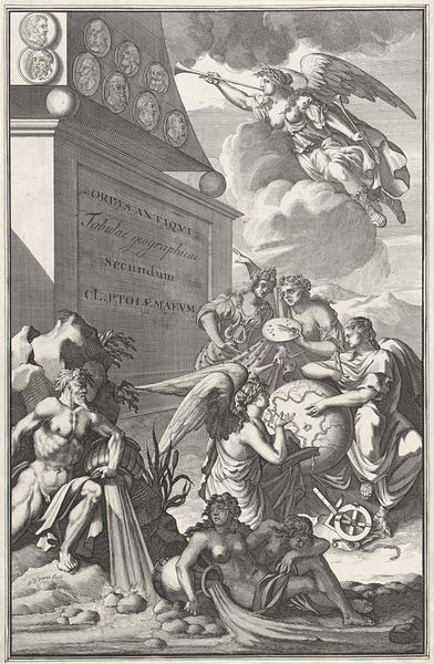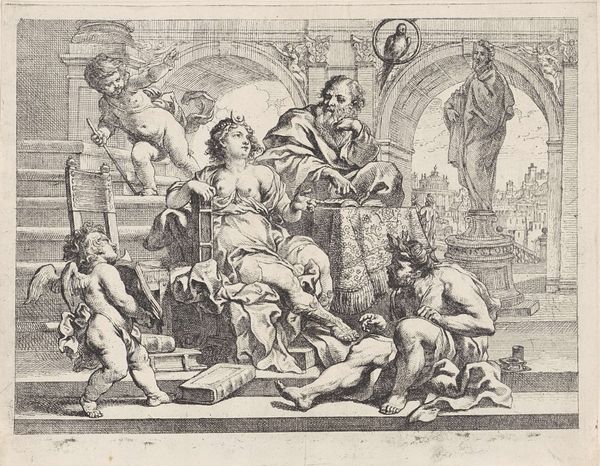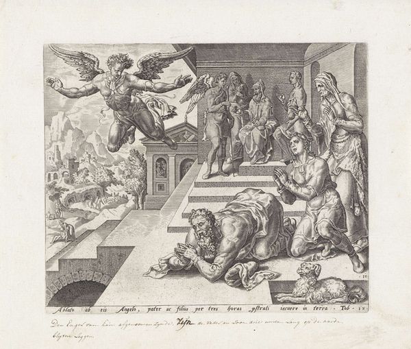 Editor: This is "Bevrijding van Phineus," or "Liberation of Phineus," an engraving by Arnoud van Halen made sometime between 1683 and 1732. It's an intense scene, pretty packed with figures, and has a distinctly Baroque feel with all the dynamic movement. I wonder what a contemporary viewer would have made of it? What catches your eye in this piece? Curator: Ah, yes, Van Halen really throws us into the thick of it, doesn't he? Immediately, I'm struck by the theatricality. Think of it as Baroque drama frozen in ink! It’s based on a story from Ovid’s Metamorphoses where Phineus is being tormented by these bird-like women, the Harpies, who keep stealing or befouling his food. And there in swoops Boreas's sons to rescue him! Can you feel the tension radiating from the image? Editor: Absolutely! The Harpies look terrifying, but what about the other figures? The faces seem exaggerated… almost like caricatures. Curator: Precisely! It's fascinating how Van Halen uses classical realism but injects these near-grotesque expressions. It’s like he is saying that underneath the polished veneer of mythology lurks the messy, uncomfortable truth of human experience. And don't overlook how he manipulates light and shadow to create depth, enhancing the overall dramatic effect. Does the Latin text at the bottom perhaps reveal something more about its intention? Editor: The text certainly frames it in its classical origins, giving the overall engraving a timeless feel and sense of intellectualism. The dynamic tension alongside these elements creates an intriguing piece! Curator: Indeed. The artwork becomes an artifact for deeper reflection. The convergence of classical and creative styles makes this a piece that resonates even centuries later.