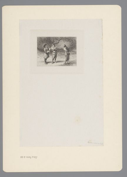 Editor: So, this is "Oronte, Alceste en Philinte" by Jean-Antoine-Valentin Foulquier, from around 1878 or 1879. It looks like a drawing or print on paper, with three figures in what seems to be a tense discussion. There is definitely a sense of theatricality. What do you make of it? Curator: Immediately, my mind jumps to the visual language surrounding ideas of debate and social decorum. Do you notice how the figures are arranged? Consider the body language--gestures, posture... how do they symbolize conflict and compromise? Editor: Yes, the figure on the left is gesturing emphatically, while the two on the right seem more reserved. I wonder what they are arguing about! Curator: Exactly! Think about the recurring motif of trios in art. In what ways does the arrangement of three figures suggest an emotional and psychological dynamic? Are the characters embodiments of distinct philosophical positions, perhaps? Editor: Possibly. Are those characters based on famous figures? I feel like this image carries the weight of some sort of history, but I am unsure what it may be referencing. Curator: Perhaps characters from a play or literary work? Often these works provide allegorical insight to present day conditions of their time. Do you find any elements which signal the image's historic context? What visual elements can we trace through history to gain understanding? Editor: The clothing and the interior design certainly seem like clues pointing to another era. Thinking about this work symbolically does help reveal hidden stories. Thanks! Curator: Absolutely! Symbols help the viewer travel across eras, linking present understandings with the cultural contexts of the past.