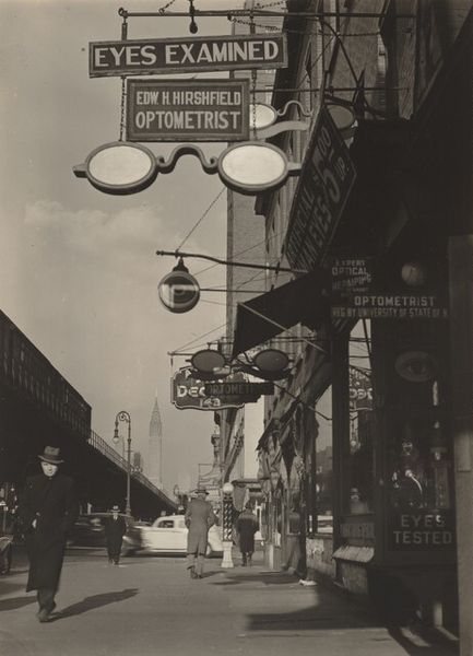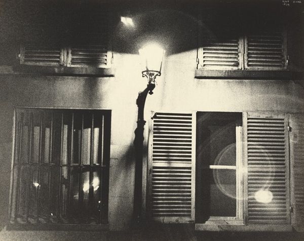 Curator: Ilse Bing’s photograph, "8 rue de Varenne, Paris," taken in 1934, captures a seemingly mundane street corner, transformed through her distinct artistic vision. Editor: It’s stark, almost ghostly. The intense contrast between the glowing lamplight and the shadowed street sign gives it a wonderfully eerie feeling, doesn't it? The image almost seems to swallow the viewer. Curator: That stark contrast speaks to the visual language of modernism that Bing adopted, especially how it was uniquely informed by her experience as a woman navigating the spaces of interwar Paris. Think of her relationship with the 'new woman' archetype. Editor: That’s interesting. Can you elaborate? Curator: Certainly, her choice to focus on streetscapes reflects the expanded freedoms that allowed women to traverse the city more independently. The lamplight isn’t just illumination; it’s a symbol of women entering and transforming spaces previously defined by patriarchal control. We must not dismiss these symbols as a mere feature. Editor: I see that, viewing it as more than a purely aesthetic composition. It makes me consider the very act of photographing in public—that, in itself, becomes a statement. There’s a defiance there. A capture of previously, and continuously, unseen corners of urban life. Curator: And the framing! Note how she uses the geometry of the light fixture and the sign to draw us into that dialogue, encouraging questions around power and representation within an overtly patriarchal space. The city isn't neutral territory; it's built upon existing structures of dominance and prejudice, of which Bing is pointing at! Editor: Absolutely. That Art Deco style sign against the softened grayscale; it brings a kind of stylized grit to the discussion, which seems appropriate for the period. The photograph presents Paris with a subtle, subversive tension. Curator: Indeed. Bing’s photography captures the changing dynamics of Parisian society while quietly demanding a new vision. It pushes back against convention, asking viewers to examine the world around them with greater intentionality and from diverse perspectives. Editor: So, from an apparent, ordinary photograph, emerges a complex dialogue on urban space and social politics! This photograph seems to be less about the specific locale and more about who controls those streets—in every way.