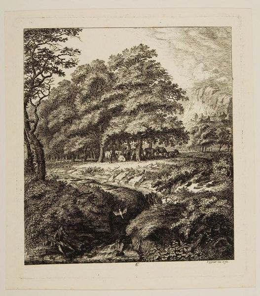 Editor: This is Salomon Gessner's "Landscapes Dedicated to Watelet," created sometime in the 18th century. It's a detailed landscape scene, almost dreamlike. What strikes you most about the cultural context of this work? Curator: Gessner’s idealized landscapes were a direct response to the burgeoning industrial revolution. Notice how the print romanticizes the natural world, offering an escape from the realities of urban life? How does this idyllic scene function as a commentary on societal change? Editor: It’s fascinating how art can be both escapist and socially conscious! I hadn't considered that connection before. Curator: Exactly! The politics of imagery are always at play, reflecting and shaping public sentiment. It makes you wonder, what escapes are we currently consuming?