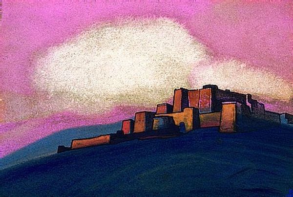 Curator: Nicholas Roerich created "Tibetian fortress" in 1936. The artwork is realized in tempera. Editor: The first impression is dreamy. The colour palette of pinks, blues and browns, it feels both ethereal and grounded. Curator: Roerich’s Orientalist works like this one often carry layers of sociopolitical commentary, don't they? "Tibetian Fortress", painted in 1936, exists at a volatile point in history as anxieties rise surrounding Soviet and Nazi expansion, yet seems indifferent to these looming conflicts. Editor: Absolutely, the way the forms are simplified and almost monumental invites us to consider the sheer weight of history—there’s a certain permanence about the fortress despite the dreamlike, ephemeral quality of the sky. Note the contrast in texture: the sky is smooth and almost featureless, while the mountain and fortress have a rougher, granular quality, probably the result of layering tempera paint. Curator: These fortresses had strategic importance, Roerich captures this silent enduring strength but also considers the cultural identity that intersects with this area during a rise in social consciousness towards Asian marginalization. This period coincides with growing political tensions in Asia and the rise of nationalist sentiments globally. It's also an incredibly violent time for marginalized groups due to an emergence of racist science theories of cultural heriarchy and racial capitalism. Editor: I can see that the artist really leans on simplification in composition to highlight both material and pictorial unity: everything from the brushstrokes to the colour relationships appear unified through what seems like a careful blending of hues and pigment consistencies. Curator: Considering Roerich’s ties to the Theosophical Society, this could be about humanity’s cultural endurance in face of political conflicts. It feels like an open challenge for the viewer to meditate on, especially for those aware of how geopolitics impact cultural expression. Editor: I agree. Ultimately, I think that the harmony between color and form provides an emotional resonance, transcending the boundaries of historical moment to offer contemplation on timelessness and durability. Curator: The artwork really underscores a larger reflection on the cultural dynamics inherent within geopolitics through form, doesn’t it?