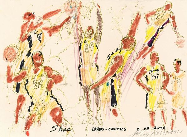 This is a drawing of the Los Angeles Lakers, by Jack Davis. He was best known for his dynamic caricatures, which appeared in magazines like Mad. Here we see two players from the Lakers basketball team, caught in a moment of sporting action. Davis made his name during the postwar expansion of a mass media and entertainment industry. As new institutions arose, so did new opportunities for artists like Davis to both reflect and shape American culture. The exaggerated style is typical of caricature, where visual codes are used to playfully distort reality. What is emphasized? The players’ athleticism? Their emotional state? The branding of the team? These are all part of the spectacle. As historians, we might ask: what can this tell us about the changing face of sports and celebrity culture in America? To address this we might look at contemporary magazines or marketing materials to get a better picture of the socio-economic context.