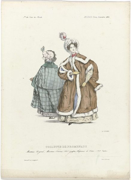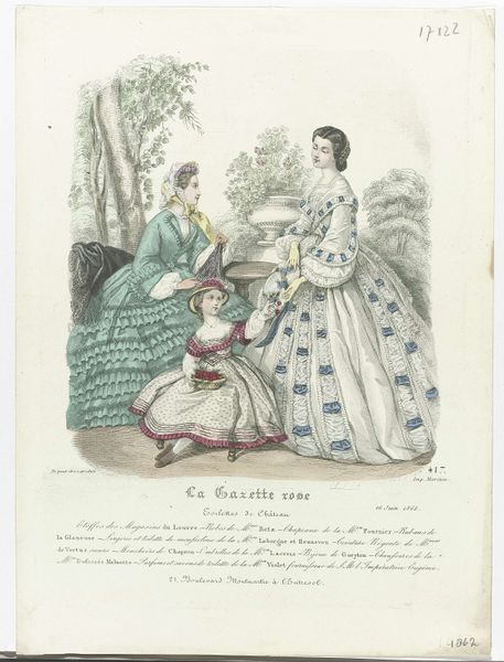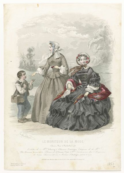 This is an engraving from "Le Journal des Dames et des Demoiselles," a Belgian fashion magazine published in 1855. It offers us a glimpse into the visual culture of the mid-19th century. The magazine caters to upper and middle-class women, illustrating the latest trends in clothing and accessories. What we see here are not just pretty dresses, but also coded messages about femininity, social status, and aspiration. The elaborate gowns, bonnets, and shawls speak to a culture of conspicuous consumption, where fashion was a key way to perform identity. The attention to detail—the lace, the ribbons, the pleats—suggests the labor involved in creating these garments, labor most often performed by women of a lower social class. While these images present an idealized vision of womanhood, it's worth considering the broader context. As we observe the demure posture and carefully constructed appearance, we might also think about how gender roles and class distinctions were being reinforced through these images. This image provides a valuable window into the complex interplay between fashion, identity, and society in 19th-century Europe.