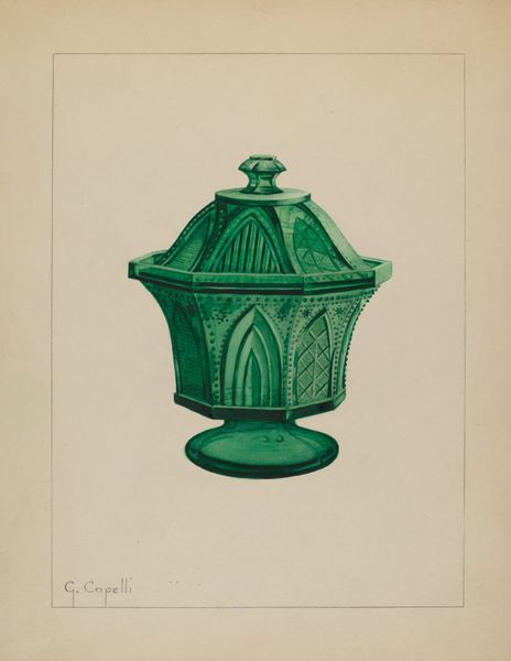 This drawing presents a green sugar bowl made by Giacinto Capelli. The arched motifs, recurring throughout the bowl’s design, echo those found in Gothic architecture. These arches evoke a sense of height and aspiration, reminiscent of the sacred spaces they often adorned. Consider how similar pointed arches appear in reliquaries. These containers hold sacred relics, embodying a connection between the earthly and divine. The arches direct the viewer's gaze upward, symbolizing spiritual transcendence and beckoning towards the heavens. Similarly, the arches adorning this sugar bowl elevate the mundane act of taking sugar to something of higher value and appreciation, transforming the everyday into something almost ceremonial. Through the simple motif of the arch, we witness the enduring power of symbols, transcending time and context. They recur and evolve across cultures, speaking to our collective psyche and leaving us to ponder the complex interplay between past and present.