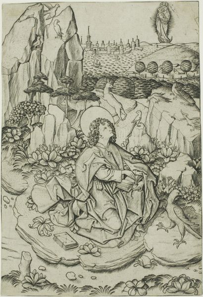 Hieronymus Bosch painted Saint John the Evangelist on Patmos with oil on panel. The composition divides itself into a distinct foreground and background. The background fades to a hazy, almost dreamlike atmospheric perspective. Bosch sets up a dynamic interplay between the earthly and the divine, contrasting Saint John’s solid, grounded presence with the ethereal apparition of the Virgin Mary, destabilizing conventional spatial relationships. The colour palette is muted, lending the painting a sense of solemnity, punctuated by Bosch’s typically unsettling and grotesque figure of evil to the lower right. Bosch employs a structural strategy, contrasting elements to reveal deeper symbolic meanings. Is it a meditation on faith, doubt, and the struggle between good and evil? Note how Bosch’s signature blend of detailed realism and surreal invention invites ongoing interpretation of his unique visionary world.