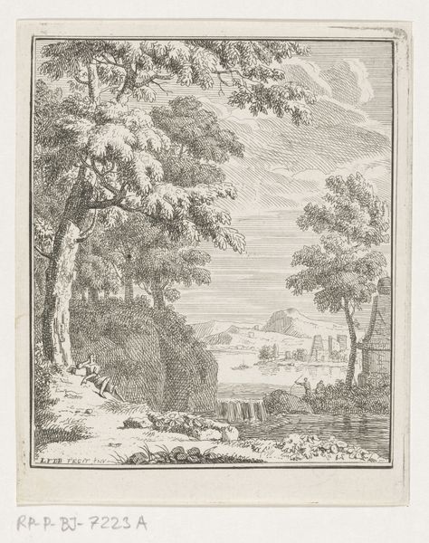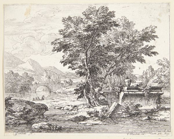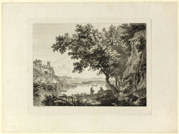 Editor: This is Paul Sandby's "Capriccio with Edinburgh Castle and Arthur's Seat," an etching from 1750. It’s amazing how much detail he achieves with just lines. What sort of story do you think this landscape is telling? Curator: The symbols in this landscape really strike me. The castle, iconic and perched above, embodies established power, doesn't it? Yet, it's framed by the wildness of Arthur’s Seat and that expressive tree, hinting at a tension between civilization and the untamed natural world. Editor: That tension is definitely there. It feels like he's not just depicting a place but also a feeling or idea. Curator: Precisely. The figures, rendered so small, seem almost inconsequential against the grandeur of the scene, highlighting nature’s dominance, a popular theme for Romanticism. Have you noticed how the light almost seems to dramatize the landscape? What might that mean, do you think? Editor: That contrast makes everything appear more dramatic. Almost like the land has history to reveal! I think that etching looks as though Sandby wanted viewers to create an impression of Scotland themselves. Curator: That is astute! He evokes the mood rather than dictating it. Sandby is subtly asking us what that landscape means to us. The symbolic layering invites our own cultural associations and memories. Editor: I didn't realize how much a landscape could hold, both literally and figuratively! Curator: Yes, looking closely at the symbols and cultural context helps us unlock layers of meaning. Hopefully, more visitors will feel they can see beyond the surface.